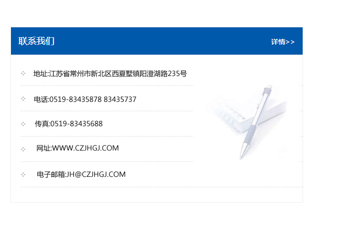地址:常州市新北區友邦商務大廈1幢16、17層  電話:0519-85101652  傳真:0519-85112595  郵編:213022  網址:www.cz-jiayue_cn.yiao88.com  郵箱:xiajifengaa@163.com